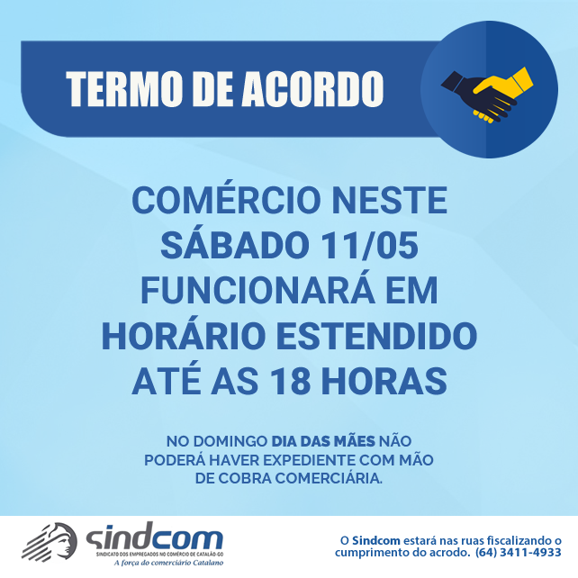 Termo de Acordo, que entre si fazem, de um lado, o Sindicato do Comércio Varejista de Catalão, e de outro, o Sindicato dos Empregados no Comércio de Catalão - Sindcom, com relação ao dia 11/05/2019 (sábado), véspera do Dia das Mães, as entidades patronal e laboral, A TÍTULO DE EXCEÇÃO E A CRITÉRIO DA EMPRESA, estenderam a jornada de trabalho, ficando definido o horário das 08h às 18h, onde deverá ser aplicado o disposto na Cláusula 26ª, parágrafo primeiro, da Convenção Coletiva de Trabalho.