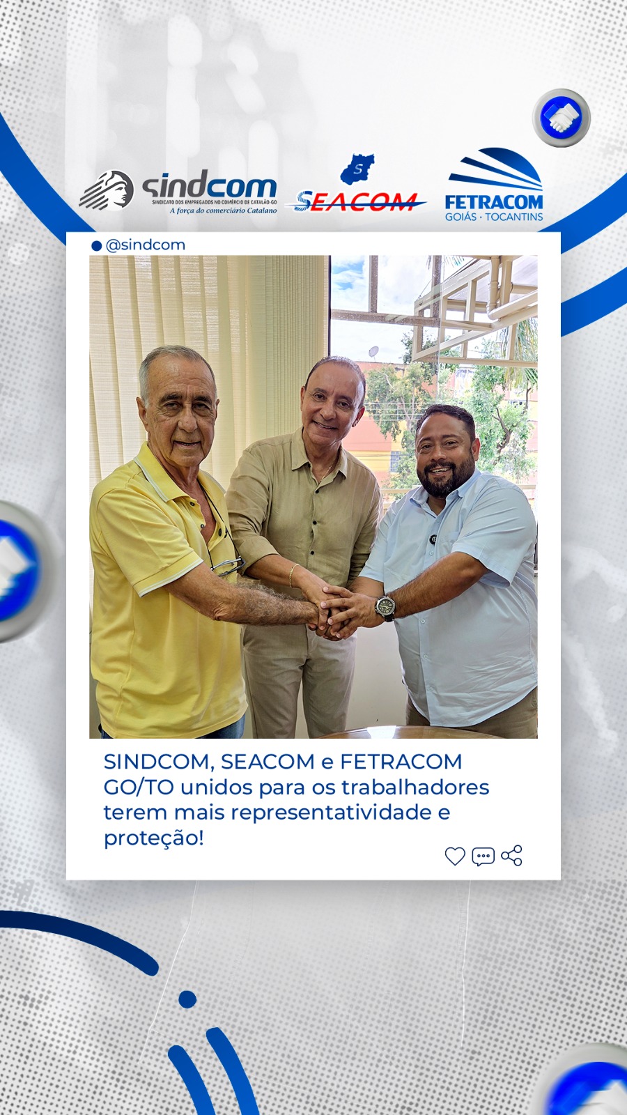 O presidente do SINDCOM (Sindicato dos Comerciários de Catalão), Everton Alves (Pingo), o presidente do SEACOM (Sindicato dos Empregados de Agentes Autônomos de Comércio do Estado de Goiás), Arioldo Carvalho Vasconcelos, e o presidente da FETRACOM GO/TO (Federação dos Trabalhadores no Comércio nos Estados de Goiás e Tocantins), Eduardo Amorim, firmaram uma importante parceria com o objetivo de fortalecer a representação dos trabalhadores do SEACOM.